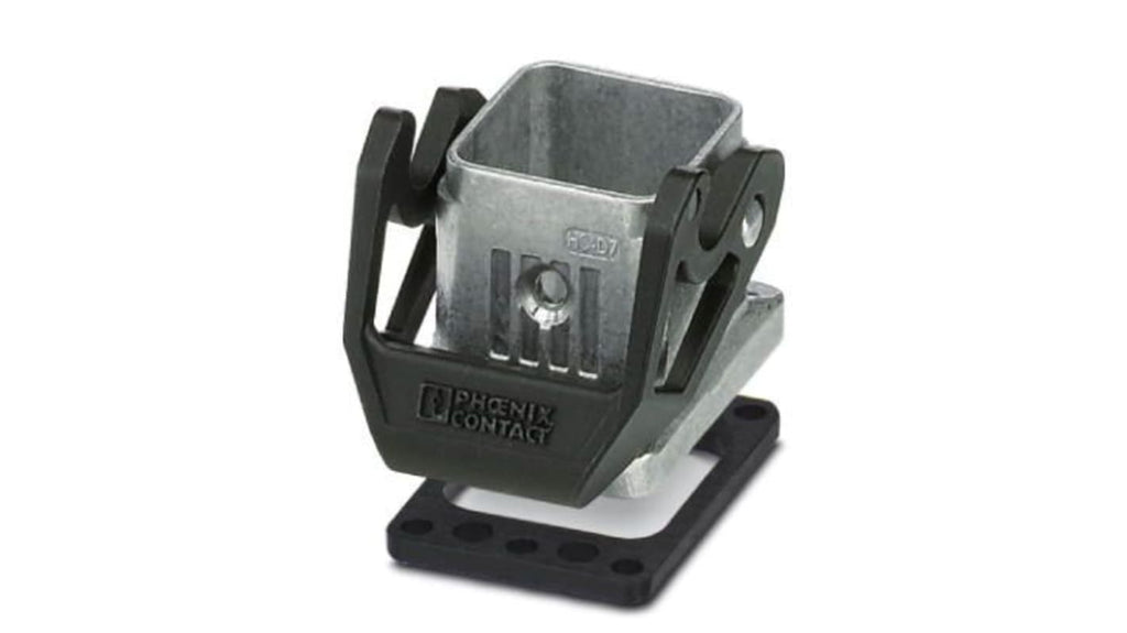 Base per montaggio a pannello D7, chiusura a scatto singola, materiale in alluminio pressofuso, resistente all'acqua salata, altezza 25,5 mm. Compatibile con inserti contatto A04, D07, D08, HC-A03, Q02, Q03, Q04, Q05, Q07, Q12. Codice costruttore 1419249, marchio Phoenix Contact.