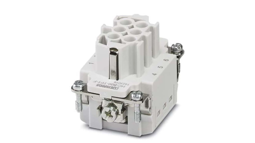 Inserto contatti femmina per connettore di potenza, serie HC, corrente nominale 16A, 6 vie più PE, materiale contatto in lega di rame con placcatura in argento, temperatura d'esercizio da -40 a 125 gradi, grado di inquinamento 3, III categoria di sovratensione. Prodotto non incluso nella gamma "complete Line" di Phoenix Contact. Codice costruttore 1423016.