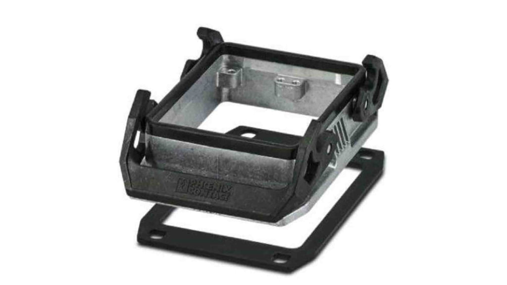 Montaggio a pannello Phoenix Contact, serie HC, in alluminio pressofuso, con doppia chiusura di bloccaggio, guarnizione piatta inclusa, resistente all'acqua salata, temperatura d'esercizio da -40 a 125 gradi Celsius, grado di infiammabilità UL 94 V0. Non fa parte della gamma "complete Line". Specifiche: Tipo montaggio a pannello, serie HC, gamma HEAVYCON.