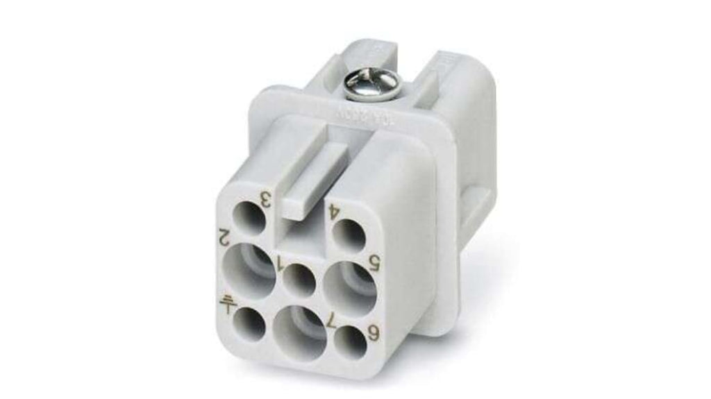 Modulo maschio per connettori, serie HC-D07-I-CT-F-42V, corrente nominale 10A, 7 vie più PE, collegamento a crimpare, contatti in lega di rame con placcatura in argento, temperatura operativa da -40 a 125 gradi Celsius. Codice costruttore 1425006, marchio Phoenix Contact.