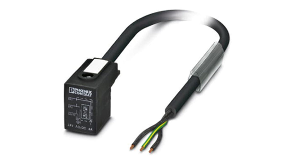 Cavo sensore/attuatore, 3 conduttori, lunghezza 1,5 m, connettore DIN 43650 Form B, senza terminazione, colore guaina nero/grigio, materiale guaina PUR, corrente nominale 4 A, tensione nominale 24 V, protezione IP65/IP67, estremità del cavo libera, con diodo Zener per protezione, LED integrato, componenti a innesto testati elettricamente al 100%. Codice costruttore 1435234, marchio Phoenix Contact.