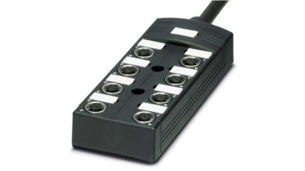 Scatola sensore/attuatore Phoenix Contact, connettore M12, 8 porte, codifica A - standard, assegnazione slot doppia, collegamento fisso a 180 gradi, lunghezza cavo 5 m, materiale PUR/PVC, senza schermatura. Non dotata di display di stato. Prodotto universale, codice costruttore 1457364.