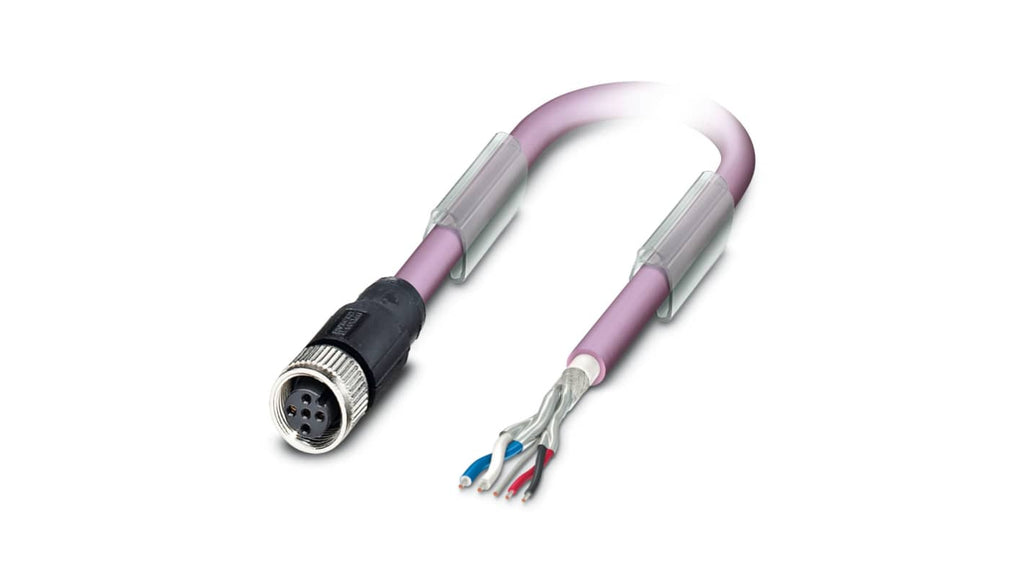 Cavo industriale multipolare schermato a 5 conduttori, sezione 2x 0,25 mm², lunghezza 15 m, con connettore maschio diritto M12. Guaina esterna in poliuretano di colore porpora, senza alogeni. Materiale contatto in CuSn, superficie del contatto in Ni/Au. Conforme allo standard IEC 60332-1-2.