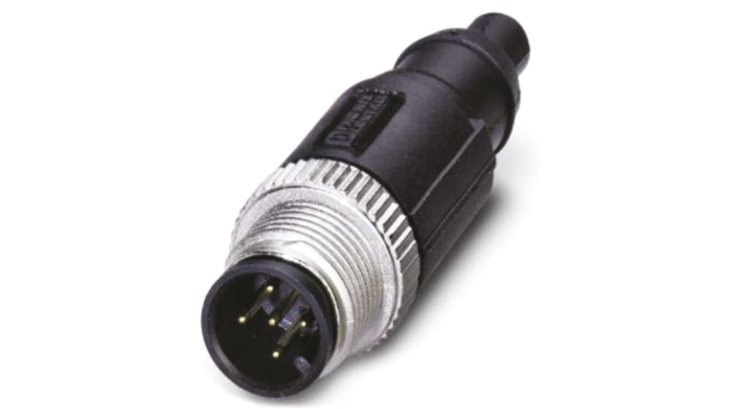 Connettore circolare maschio M12, serie SACC, 5 poli, montaggio su cavo, grado di protezione IP67, filettatura M12 x 1 mm, corrente nominale 4 A, tensione nominale 60 V, temperatura operativa da -25 °C a +90 °C, corpo in TPU, terminazione a vite, conforme RoHS e standard di controllo elettrostatico ANSI/ESD S20.20:2014. Peso 8.09 g. Codice costruttore 1507816.
