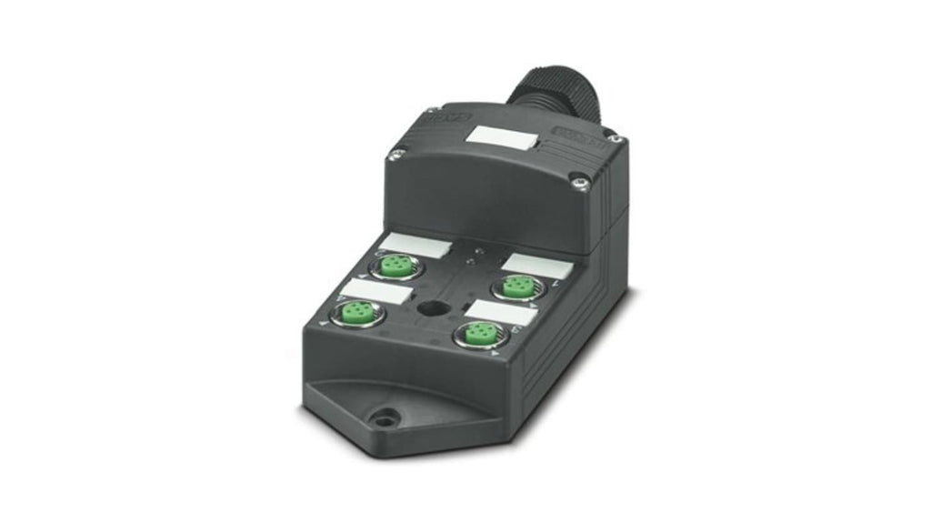 Scatola sensore Phoenix Contact, 4 porte, connettore M12. Tensione nominale 120 V c.a., corrente nominale totale 10 A, sistema di collegamento con connettore femmina M12-SPEEDCON, materiale del contatto in lega di rame, grado di protezione elevato, installazione con bloccaggio rapido SPEEDCON, riconoscimento UL, cUL, EAC, cULus. Dimensione connettore M12, serie SACB.