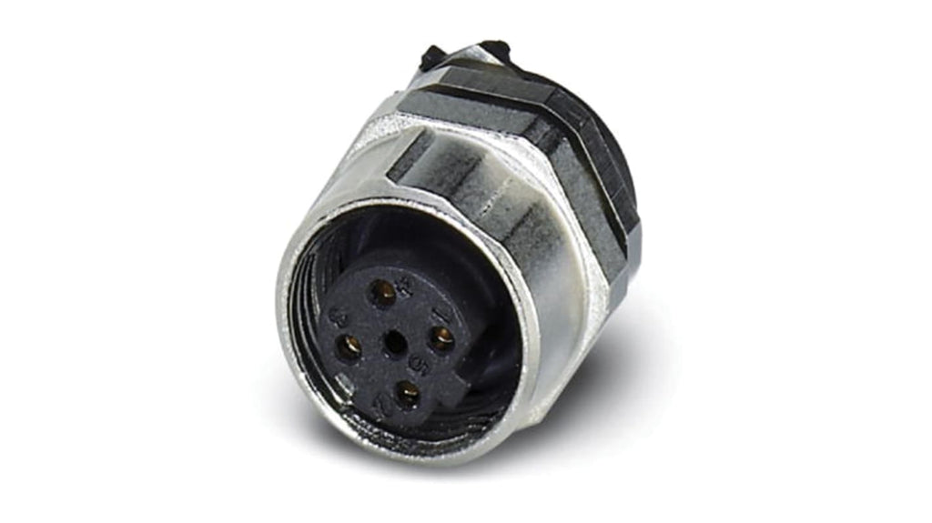 Connettore circolare femmina M12, 4 poli, serie SACC, codifica D, montaggio posteriore a vite con filettatura M12, collegamento a saldare THR diritto, protezione contro l'inversione di polarità, grado di protezione IP67. Utilizzabile per sistemi bus ed Ethernet. Codice costruttore 1542648, marchio Phoenix Contact.
