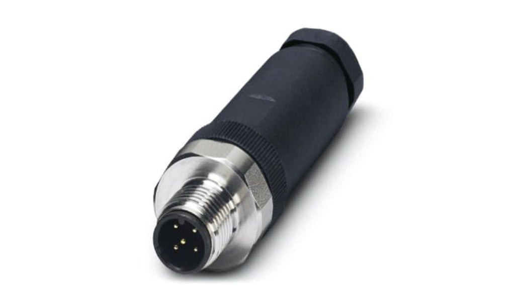 Connettore circolare maschio M12, serie SACC, 5 poli, attacco a vite, materiale zigrinato in acciaio inox, pressacavo PG9, diametro esterno cavo 6 mm - 8 mm, protezione IP65, IP67, IP69K, tecnologia di collegamento collaudata, uso sicuro sul campo. Codice costruttore 1553190, marchio Phoenix Contact.