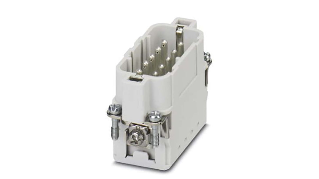 Inserto contatti maschio per connettore di potenza, serie HC, 16A, 10 vie, materiale contatto in lega di rame con placcatura in argento, temperatura d'esercizio da -40 a 125 gradi Celsius, grado di inquinamento 3, III categoria di sovratensione. Progettato per il design del contenitore HEAVYCON D15. Codice costruttore 1585359, marchio Phoenix Contact.