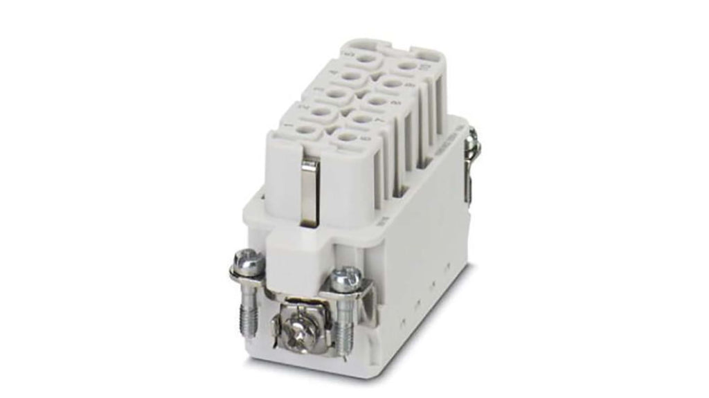 Inserto contatti femmina per connettore di potenza per impieghi pesanti, corrente nominale 16 A, 10 contatti, tensione nominale 250 V, placcatura in argento, materiale contatto in lega di rame, supporto in policarbonato resistente all'usura, ciclo di inserimento/ritiro ≥500, gamma di temperatura -40°C a +125°C, grado di infiammabilità UL94 V0, compatibile con fili 26-14 AWG. Codice costruttore 1585362, marca Phoenix Contact.