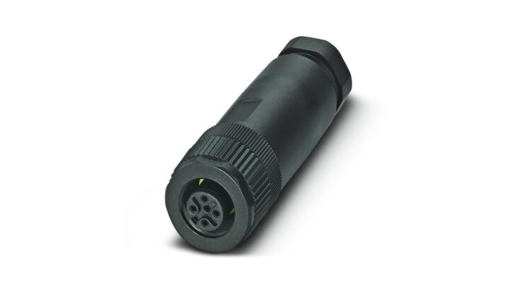 Connettore circolare femmina M12, 5 poli, marca Phoenix Contact. Tecnologia di collegamento a vite per conduttori vari, materiale in plastica, grado di protezione IP67. Specifiche: numero di contatti 5, dimensione connettore M12, tipo connettore femmina.