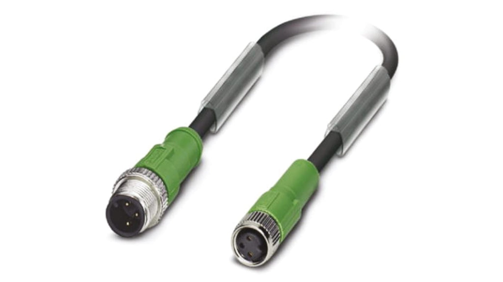 Cavo sensore/attuatore M8-M12, 3 vie, lunghezza 1.5m, guaina in PUR nera, conduttori 0,25 mm², grado di protezione IP67, temperatura d'esercizio -25 a 90 gradi Celsius, 100 cicli di accoppiamento, codifica A, connettore femmina M8 ad angolo retto, connettore maschio M12 ad angolo retto, non schermato, autorizzazioni UL, cUL, cULus, GOST.