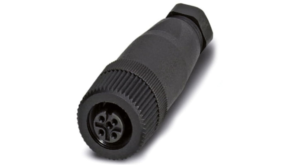 Connettore circolare femmina M12, serie SACC, 4 poli, montaggio su cavo. Grado di protezione IP67, temperatura operativa da -40 a +85 gradi Celsius, corrente nominale 4 A, tensione nominale 250 V. Connessione a vite, compatibile con vari conduttori, materiale custodia in termoplastica, contatti in ottone. Certificato secondo IEC 61076-2-101, orientamento ad angolo diritto, codifica A.