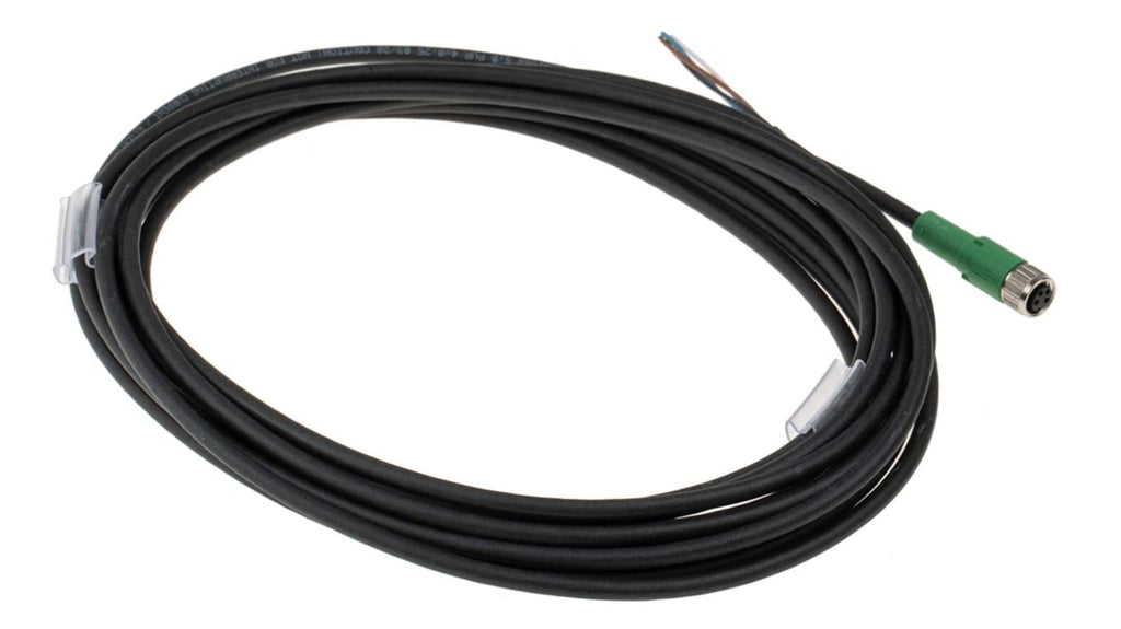 Cavo sensore/attuatore M8 Femmina, senza terminazione, lunghezza 5 m, 4 conduttori, dimensione filo 24 AWG, tensione nominale 30 V, corrente nominale 4 A, grado di protezione IP67, guaina in PUR nera, resistenza conduttore 78 Ω/km, gamma operativa di temperatura -25 a +90 C, peso 130 g, conforme a cUL, cULus, EAC, UL.