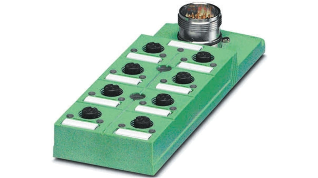 Scatola sensore Phoenix Contact, 8 porte, con connettore M12. Terminali a molla, collegamento mediante connettore maschio M23, 8 connettori femmina M12 a occupazione singola e doppia, collegamento verticale o orizzontale, LED integrato per stato di funzionamento. Materiale custodia in PBT, serie SACB.