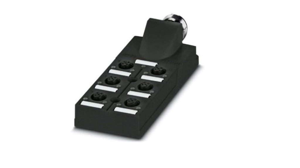 Scatola sensore Phoenix Contact, 6 porte, connettore M12. Tensione operativa 30V cc, numero di vie 5, grado di protezione IP65/IP67, approvazione EAC, riconoscimento UL, conformità RoHS. Include cavo principale e connettori femmina con codifica A a cinque posizioni. Montaggio su guida DIN NS 35/7.5. Adatta per applicazioni di automazione e interfaccia tra apparecchiature e periferiche.