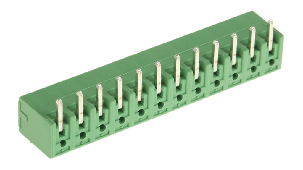 Connettore per circuito stampato a innesto, 12 vie, 1 fila, passo 3.81 mm, orientamento angolo destro, montaggio con foro passante, saldatura, corrente nominale 8 A, tensione nominale 160 V, materiale PBT verde, operatività da -40 a 100 gradi Celsius, serie MC 1.5/12-G-3.81, progettato per applicazioni industriali. Codice costruttore 1803374, marchio Phoenix Contact.