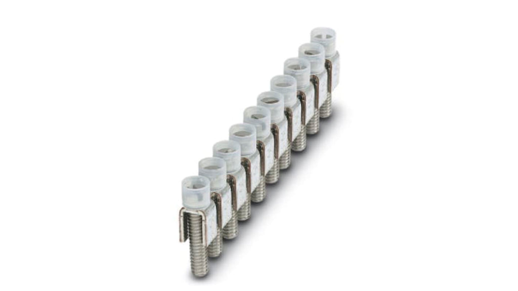 Ponte fisso per guida DIN, 10 posizioni, montaggio a vite, serie FBI 10-8. Realizzato in rame con placcatura in argento per resistenza alla corrosione. Isolamento in PA per prevenire scosse elettriche. Passo di 8 mm, dimensioni compatte, assemblaggio flessibile. Codice costruttore 203263, marchio Phoenix Contact.