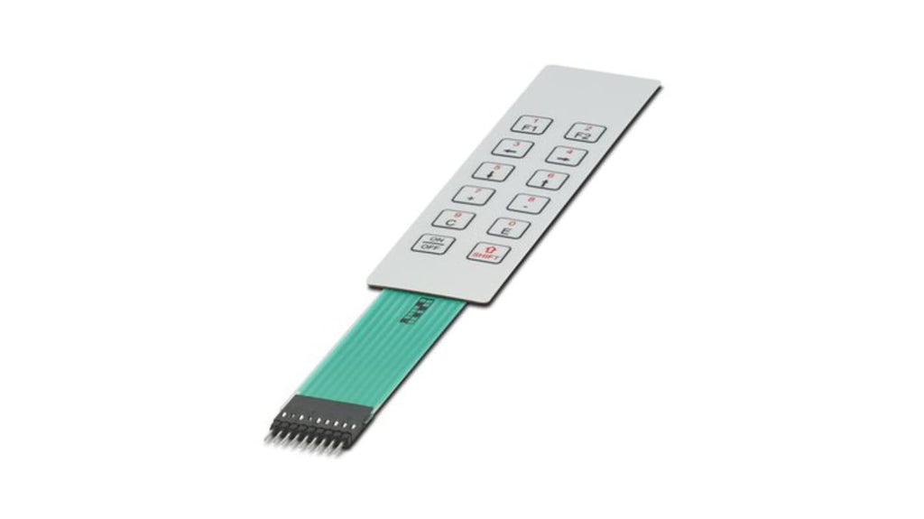 Tastiera a membrana a 12 tasti in poliestere, progettata per integrazione in custodie elettroniche serie HCS, temperatura di esercizio da -20 a 70 gradi Celsius, non illuminata, durata membrana garantita. Dimensioni e colori personalizzabili. Codice costruttore 2203567, marchio Phoenix Contact.
