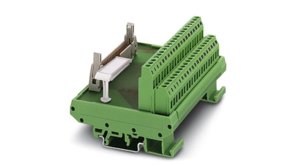 Modulo di interfaccia per montaggio su guida DIN, con connettore maschio a 16 poli, tensione nominale 50 V c.a. e 60 V c.c., corrente nominale 1 A. Compatibile con cavi di sezione da 0,2 a 4 mm² (pieno) e da 0,2 a 2,5 mm² (intrecciato). Temperature operative da -20 a +50 gradi Celsius. Dimensioni 45 x 58,5 x 77 mm, conforme alla norma BS 5584:1978. Codice costruttore 2281034.