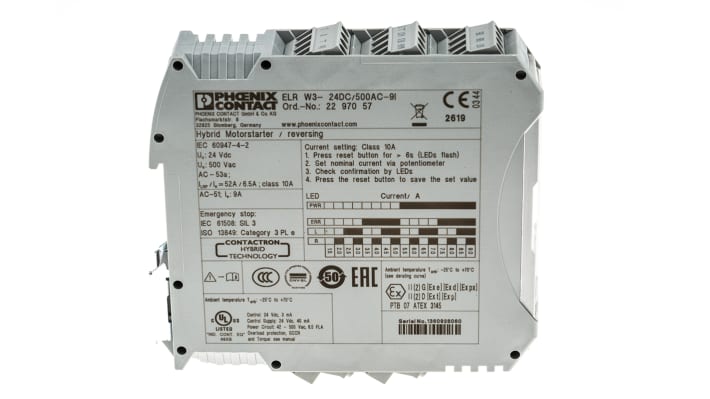 Starter per motore automatico e manuale, Phoenix Contact, 3 fasi, 500 V c.a., corrente nominale 9 A, grado di protezione IP20, dimensioni 22,5 mm x 99 mm x 114,5 mm, montaggio su guida DIN, reversibile, funzionalità di arresto di emergenza, compatibile con fili 24-14 AWG, operante da -40 a +70 gradi Celsius, certificazioni CCC, CE, cULus, EN, IEC, ATEX. Codice costruttore 2297057.