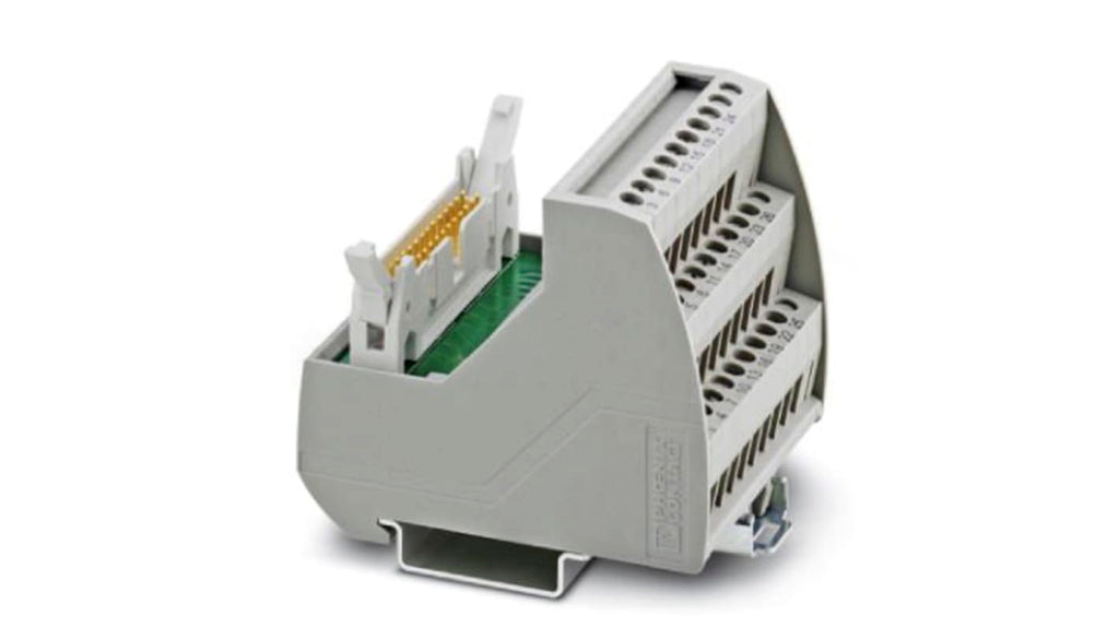 Modulo di interfaccia D-sub per guida DIN, maschio, 26 contatti, cavo ribbon piatto, tensione nominale 60 V c.a./c.c., corrente nominale 1 A, dimensioni 57,1 x 62 x 69 mm, temperatura operativa da -20 a +50 gradi Celsius, collegamento a vite, standard IEC 60603-13, alloggiamento in PA con grado di infiammabilità UL94 V0, certificazione EN 50178. Codice costruttore 2315052.