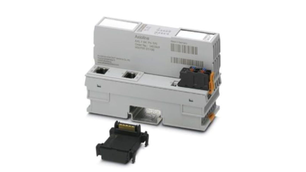 Modulo di espansione PLC Phoenix Contact per Axioline F, codice costruttore 2403869. Accoppiatore bus per rete PROFINET, collegamento fino a 63 dispositivi Axioline F, 2 porte Ethernet, temperatura ambiente da -25 a 60 gradi Celsius, grado di protezione IP20, dimensioni 126,1 x 45 x 74 mm.
