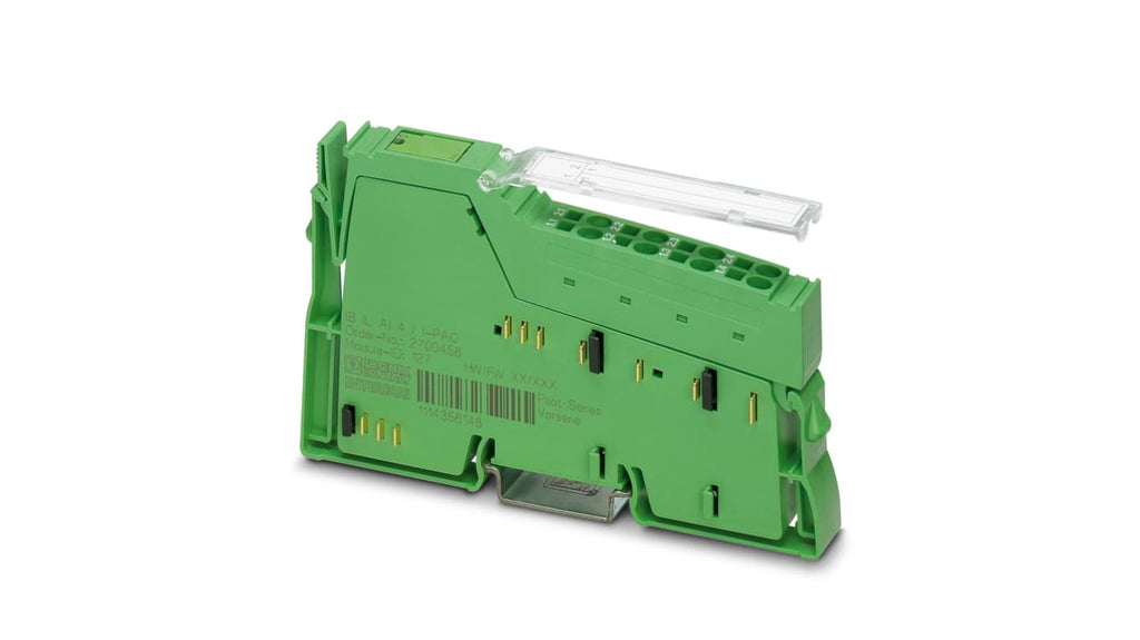 Modulo I/O PLC per applicazioni industriali, serie IB IL MBUS-PAC, ingressi analogici: 4 canali, tensioni supportate: 0 V a 10 V, -10 V a 10 V, connessione a 2 conduttori, velocità di trasmissione: 500 kbps, grado di protezione: IP20, dimensioni: 119,8 x 12,2 x 71,5 mm, temperatura operativa massima: +55°C, incluso connettore in linea e campo di etichettatura, indicatori di diagnostica e stato, aggiornamento dati in 250 microsecondi.