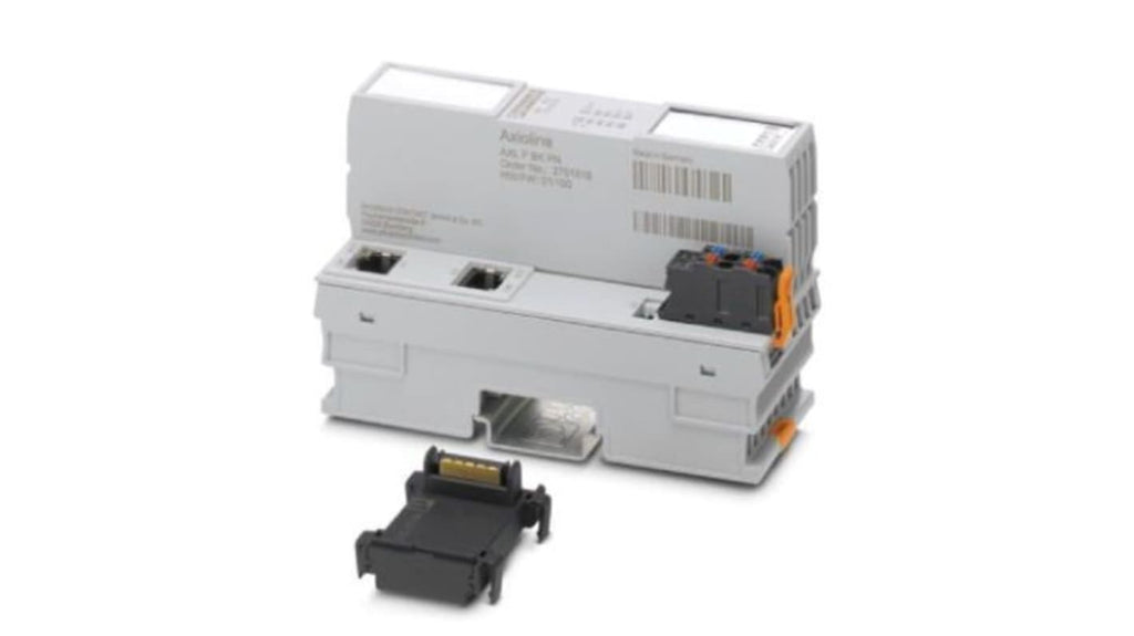 Modulo di espansione PLC Phoenix Contact per Axioline F, codice costruttore 2701815. Accoppiatore bus per rete PROFINET, collegamento fino a 63 dispositivi Axioline F, 2 collegamenti RJ45, velocità di trasmissione 100 Mbps. Temperatura ambiente da -25 a 60 gradi Celsius, grado di protezione IP20. Dimensioni 126,1 x 45 x 74 mm.