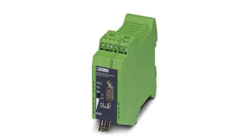 Convertitore per fibre ottiche Phoenix Contact, serie 3RS7005, ATEX. Tensione di alimentazione 18-30V DC, corrente 120mA. Interfacce RS232, RS422, RS485, CAN, CANopen, DeviceNet. Temperatura di esercizio -20 a 60 gradi Celsius. Montaggio su guida DIN, grado di protezione IP20. Certificato ATEX per ambienti pericolosi. Alloggiamento in poliammide verde, resistente a urti e vibrazioni. Standard CE, EAC.