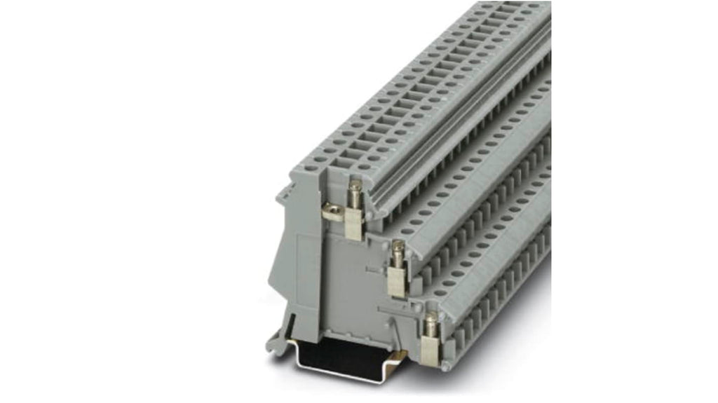 Morsetto per guida DIN senza fusibile, corrente nominale 24A, tensione nominale 250V, colore grigio, configurazione tripla, accetta cavi da 24 a 12 AWG, montaggio a vite, protezione da sovratensioni di categoria III, comportamento ignifugo, serraggio massimo 0,6 Nm, robusto contenitore in PA, standard CSA. Codice costruttore 2715966, marchio Phoenix Contact.
