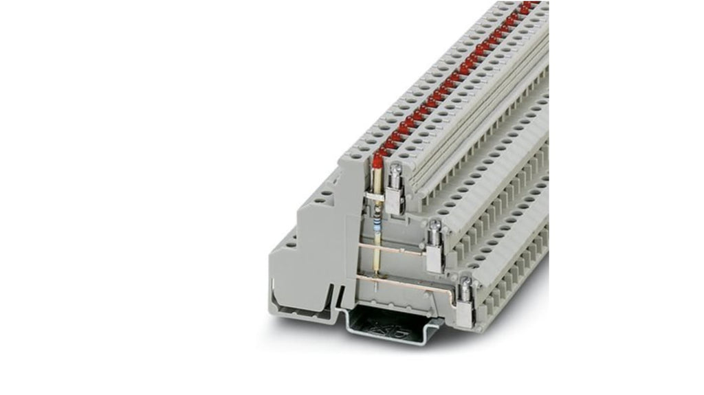 Morsettiera per sensori/attuatori, design compatto, colore grigio, livello triplo, terminazione a vite, AWG 24 a 12, cavo CSA 2.5 mm², tensione nominale 250 V, ecocompatibile, priva di sostanze pericolose oltre i valori di soglia. Codice costruttore 2716279, marchio Phoenix Contact.
