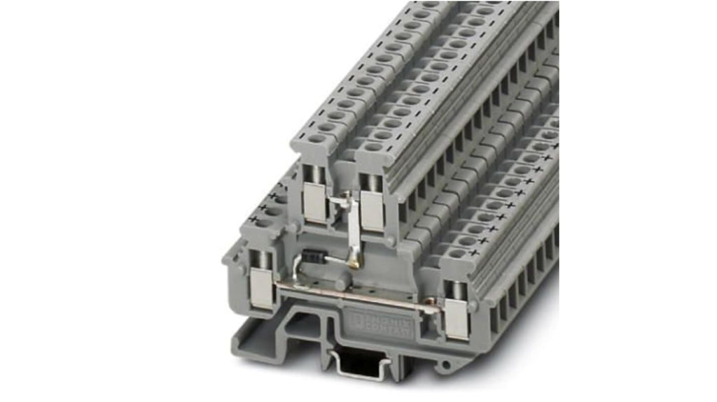 Morsettiera passante miniaturizzata, colore grigio, livello doppio, dotata di diodo 1N 4007 con tensione inversa di 1300 V e corrente continua massima di 0,5 A. Metodo di collegamento a vite. Serie MBKKB.