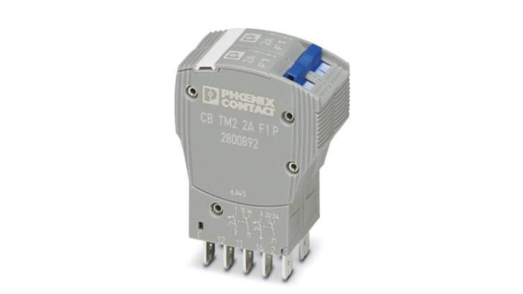Interruttore automatico termico magnetico Phoenix Contact, 2 poli, 2A, tensione nominale 80V cc, larghezza 24.6mm, serie CB TM2, colore grigio, montaggio su base, grado di protezione IP30, temperatura operativa da -30 a 60 gradi Celsius. Codice costruttore 2800892.