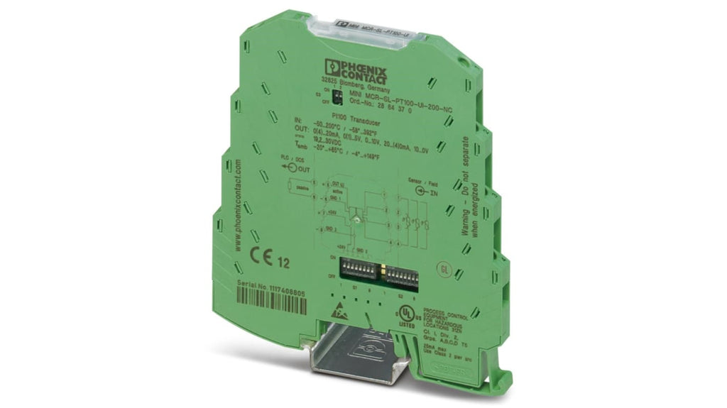 Convertitore di temperatura configurabile per PT100, gamma di ingresso da -50 a 200 gradi Celsius, uscita da 0 a 10 V o da 0 a 20 mA, tensione di alimentazione 24 V cc, montaggio su guida DIN, formato compatto di 6,2 mm, temperatura di esercizio da -20 a 65 gradi Celsius, isolamento della tensione dall'alimentazione esterna, collegamento con viti o connettori terminali.