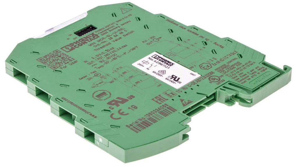 Condizionatore di segnale Phoenix Contact serie MINI MCR, ATEX, interruttore del valore limite, segnale in ingresso corrente e tensione, uscita relè, gamma di ingresso 0 a 10 V, 0 a 20 mA, tensione di alimentazione 24 V cc, montaggio su guida DIN, temperatura di esercizio -20 a +65 gradi, grado di protezione IP20, dimensioni 6,2 mm, certificazioni cUL, UL.