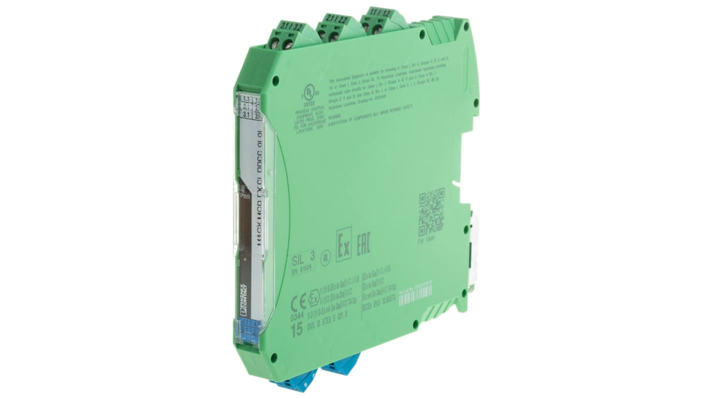 Barriera galvanica per segnali di alimentazione, 2 canali, 24V cc. Isolamento elettrico a 3 vie, grado di protezione IP20, larghezza 12,5 mm. Temperatura operativa da -20 a +60 gradi Celsius. Corrente massima 20 mA, tensione massima 125 V cc, 253 V ca. Interfaccia HART, errore di trasmissione inferiore allo 0,05%. Materiale contenitore in poliammide, resistenza elevata. Codice costruttore 2865382.