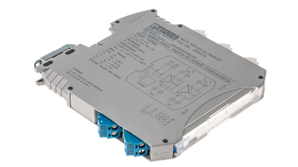 Condizionatore di segnale Phoenix Contact serie 3RS7006, amplificatore di isolamento a doppio canale, ingresso per sensori NAMUR e interruttori, uscita relè, tensione di alimentazione 19.2-30V cc, temperatura di esercizio da -20 a +60 gradi Celsius, montaggio su guida DIN, certificazione ATEX, conforme agli standard di sicurezza SIL 2, rilevamento guasti di linea, indicatori LED per monitoraggio. Codice costruttore 2865476.