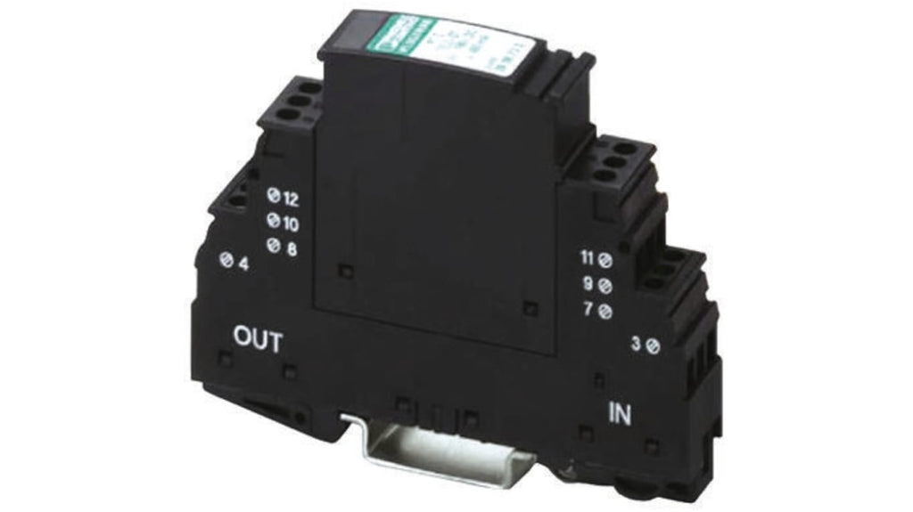 Protezione da sovracorrente per telecomunicazioni, tensione nominale di protezione 185V cc, corrente massima di sovraccarico 18kA, montaggio su guida DIN, collegamento a vite, dimensioni 90 x 17.7 x 65.5mm, gamma di temperatura operativa -40 a +85 gradi Celsius, corrente di scarica 10kA, serie PT 2-TELE, comprende presa e connettore scollegabile per facile manutenzione.