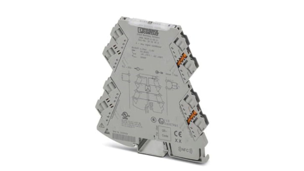 Condizionatore di segnale Phoenix Contact serie MINI MCR, tipo modulo: condizionatore di segnale, segnale in ingresso: corrente, gamma di ingresso: 4 a 20 mA, gamma di uscita: 0 a 11 V, tensione di alimentazione: 9.6 a 30 V cc, tipo di montaggio: montaggio su guida DIN, temperatura di esercizio: -40 a +70 gradi Celsius, tecnologia di collegamento a innesto, configurazione tramite DIP switch e comunicazione NFC.