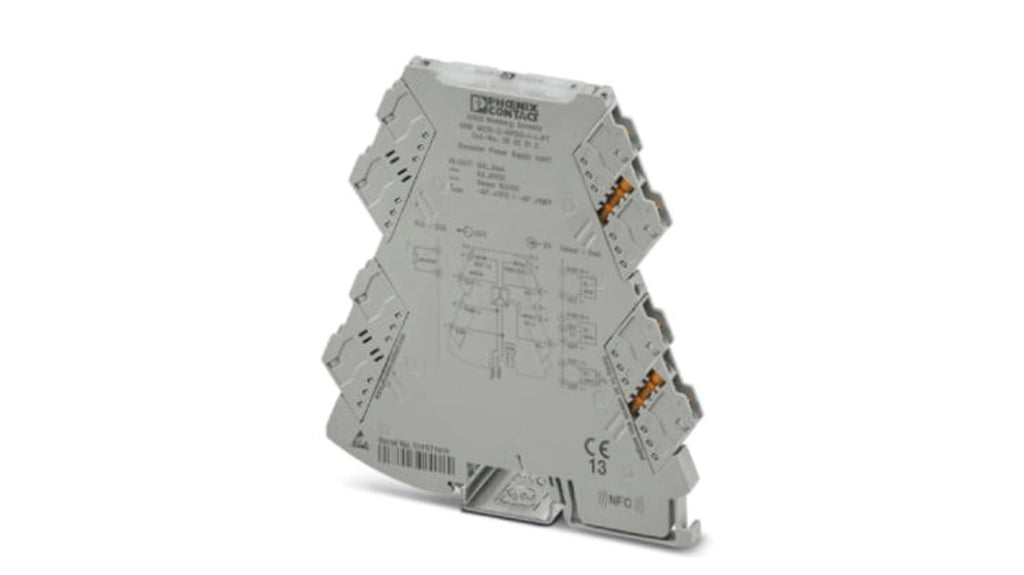 Condizionatore di segnale Phoenix Contact serie MINI MCR, modulo compatto da 6 mm, tecnologia di collegamento a innesto, isolamento galvanico, gamma di ingresso 0 a 20 mA, 4 a 20 mA, gamma di uscita 0 a 24 mA, 4 a 24 mA, tensione di alimentazione 9.6 a 30V cc, montaggio su guida DIN, temperatura di esercizio da -40 a +70 gradi Celsius.