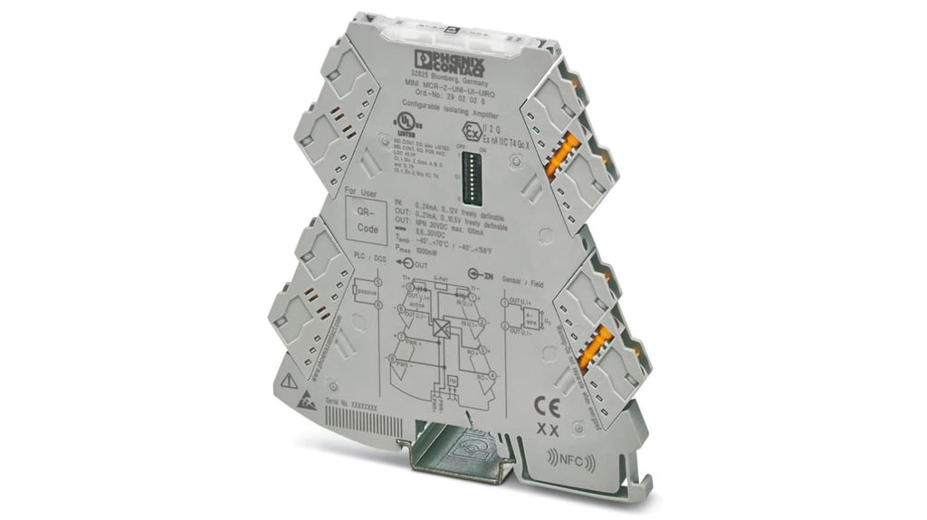 Condizionatore di segnale Phoenix Contact serie MINI MCR, tipo modulo: condizionatore di segnale, segnale in ingresso: corrente, tensione, gamma di ingresso: 0 a 12 V, 0 a 24 mA, gamma di uscita: 0 a 10,5 V, 0 a 21 mA, tensione di alimentazione: 9,6 a 30 V cc, tipo di montaggio: montaggio su guida DIN, temperatura di esercizio: -40 a +70°C, tecnologia di collegamento a innesto, configurazione tramite DIP switch e comunicazione NFC.