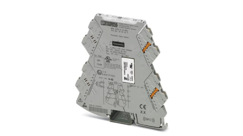 Condizionatore di segnale della serie MINI MCR, interruttore del valore limite, alimentazione 24V cc, gamma di ingresso 0 a 12V, 0 a 24mA, uscita a relè 250V c.a., 100mA a 6A, certificazione ATEX, montaggio su guida DIN, temperatura di esercizio da -40 a +70 gradi Celsius, isolamento a 3 vie, collegamento con gabbia a molla, indicazione stato ed errore tramite LED diagnostici.