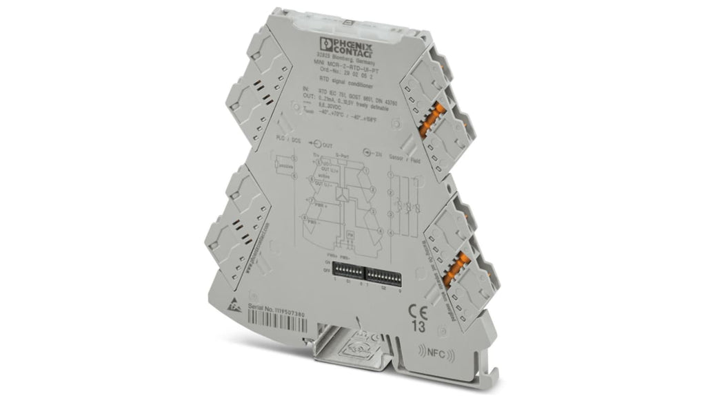 Condizionatore di segnale Phoenix Contact serie MINI MCR, codice 2902052. Modulo convertitore di temperatura RTD, gamma di ingresso 0 a 4000 Ohm, -200 a 850 gradi Celsius. Uscita 0 a 10,5 V e 0 a 24,6 mA. Tensione di alimentazione 9,6 a 30 V cc. Montaggio su guida DIN, temperatura di esercizio -40 a 70 gradi Celsius. Terminazione a innesto, tecnologia di collegamento senza utensili, configurazione tramite DIP switch o app.