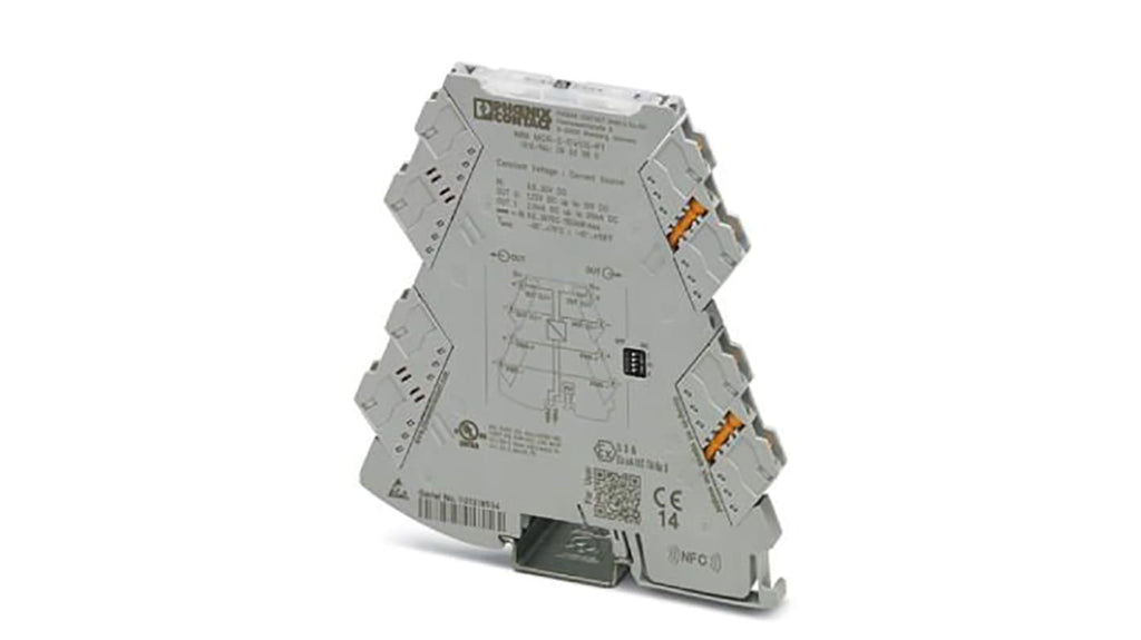 Condizionatore di segnale Phoenix Contact serie MINI MCR-2-CVCS-PT, ATEX, montaggio su guida DIN, temperatura di esercizio da -40 a +70 gradi Celsius, tecnologia di collegamento a innesto, misurazione di corrente, configurazione tramite DIP switch e app, comunicazione NFC, cablaggio senza utensili, certificazione area pericolosa.