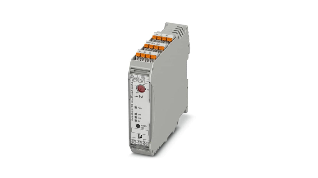 Starter per motore Phoenix Contact, modello ELR H3-I-PT-24DC/500AC-9, montaggio su guida DIN, corrente regolabile per funzione bimetallica, protezione contro l’inversione di polarità, grado di protezione IP20, conforme a EN 60947-1, EN 60947-4-2, IEC 61508, ISO 13849. Dimensioni: lunghezza 107.4 mm, larghezza 22.5 mm, profondità 113.7 mm. Commutazione a bassa usura, riduzione di tempo e costi di cablaggio.