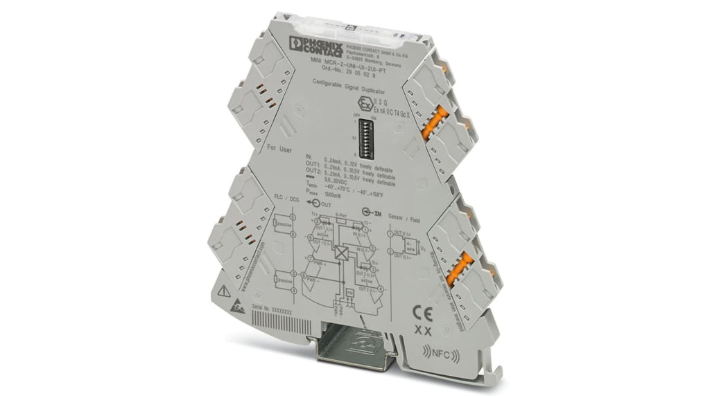 Condizionatore di segnale configurabile a 4 vie, duplicatore di segnale, gamma di ingresso 0-12 V e 0-24 mA, gamma di uscita 0-10,5 V e 0-21 mA, tensione di alimentazione 24 V cc, certificazione ATEX zona 2, montaggio su guida DIN, temperatura di esercizio -40 a +70 gradi Celsius, terminazione a innesto, isolamento rinforzato secondo IEC 61010-1.