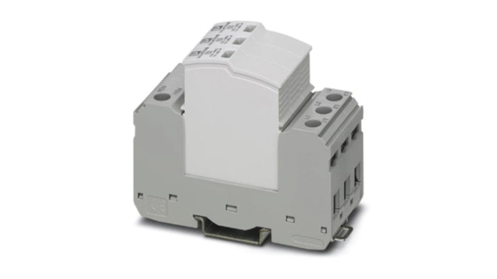 Limitatore di sovratensione trifase per guida DIN, tensione nominale di protezione 2 kV, corrente di scarica a impulsi 40 kA, dimensioni 97,9 x 37,3 x 74,5 mm, gamma di temperatura operativa da -40 a +80 gradi Celsius, grado di protezione IP20, montaggio a innesto, indicatore di stato meccanico e ottico, progettato per proteggere macchinari da eventi esterni. Codice costruttore 2905339, marchio Phoenix Contact.