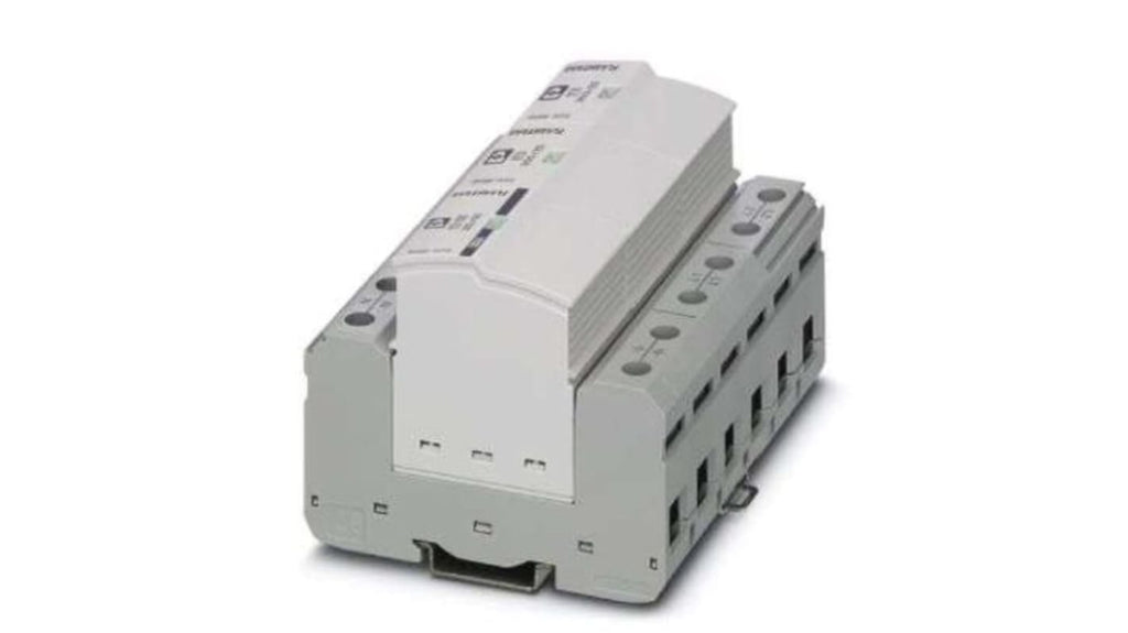 Dispositivo di protezione combinato tipo 1/2 per guida DIN. Corrente massima di sovraccarico 50kA, corrente di scarica 25kA. Dimensioni 95.2 x 106.8 x 74.5mm. Gamma di temperatura operativa -40 a +80 gradi Celsius. Dotato di indicatore di stato ottico e meccanico, contatto di indicazione remota flottante. Marchio Phoenix Contact, codice costruttore 2905418.