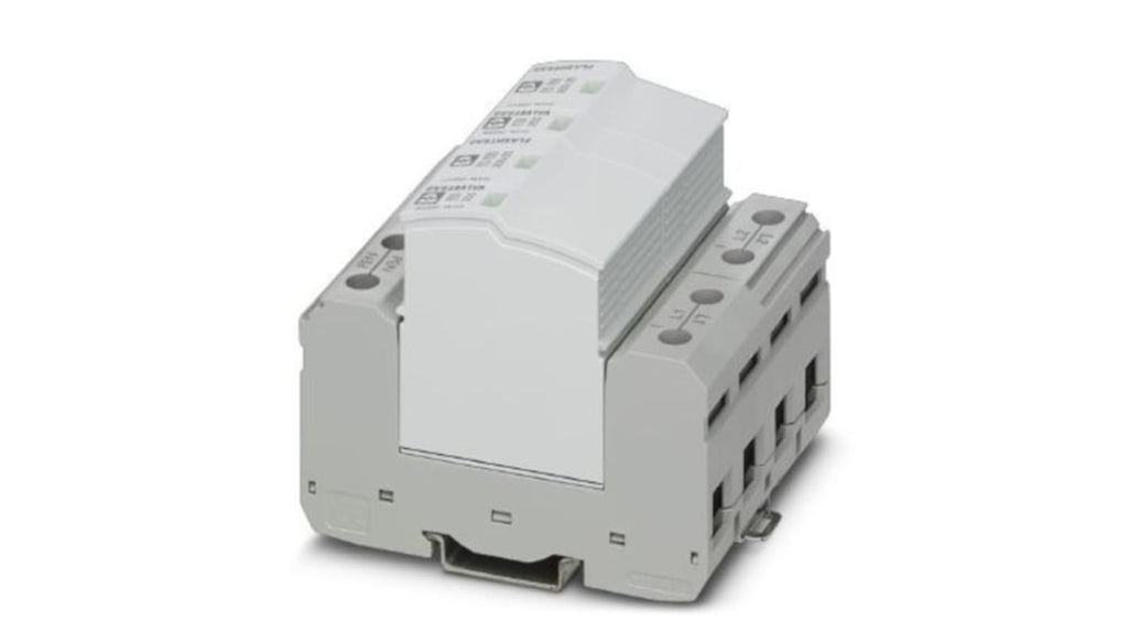 Protezione da sovracorrente per guida DIN, combinazione di dispositivi di protezione tipo 1+2, corrente massima di sovraccarico 100kA, corrente di scarica 25kA, 2 fasi, indicatore di stato ottico e meccanico, contatto di indicazione remota flottante, temperatura operativa da -40 a +80 gradi Celsius, serie FLT-SEC, marchio Phoenix Contact.