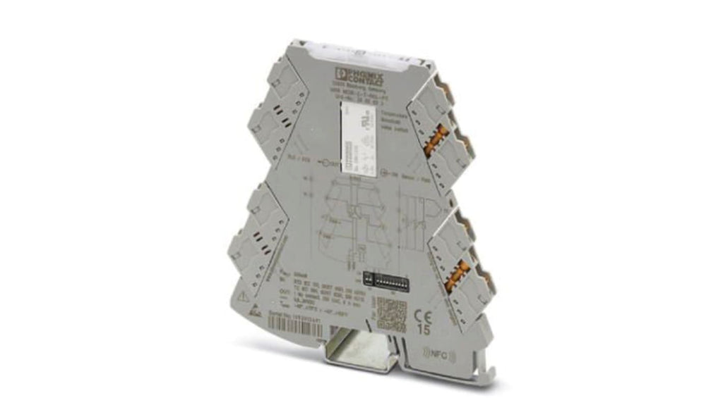 Interruttore del valore limite della serie MINI MCR, alimentazione 24V cc, gamma di ingresso 0 a 4000 ohm, uscita a relè 250 V c.a. 100 ma a 6 A, certificazione ATEX, montaggio su guida DIN, temperatura di esercizio da -40 a +70 gradi Celsius, isolamento a 3 vie, isteresi e tempo di ritardo regolabili, indicazione stato ed errore tramite LED diagnostici. Codice costruttore 2905633.